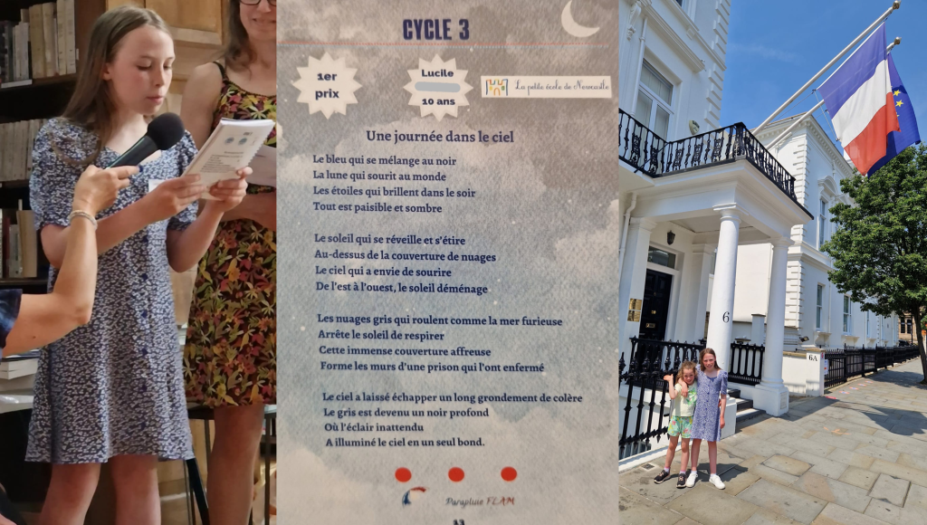 – Juin 2023 : Félicitations à Lucile qui a remporté le premier prix de sa classe d’âge lors du concours de poésie MotsEnFlam. Lucile a reçu son prix à l’Ambassade de France à Londres, où elle a également offert un très beau récital de son poème lauréat. Nous sommes très fiers de toi, Lucile ! Recueil de poésies MotsEnFlam – 2 langues 2 pays – Parapluie FLAM UK